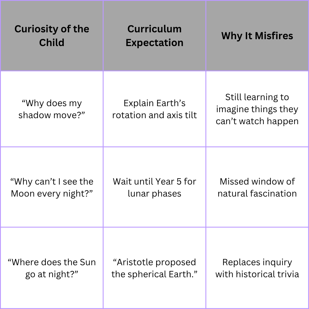 That means for the first two years of school, children won’t formally explore the very things that most capture their imagination — the Sun, the Moon, the shadows that move across the playground.